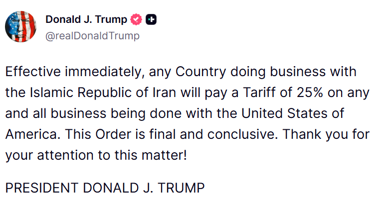 美國總統特朗普:即日起,任何與伊朗開展業(yè)務的國家,其與美國的任何和所有商業(yè)活動都將被征收25%的關稅。本命令為最終命令且具決定效力。