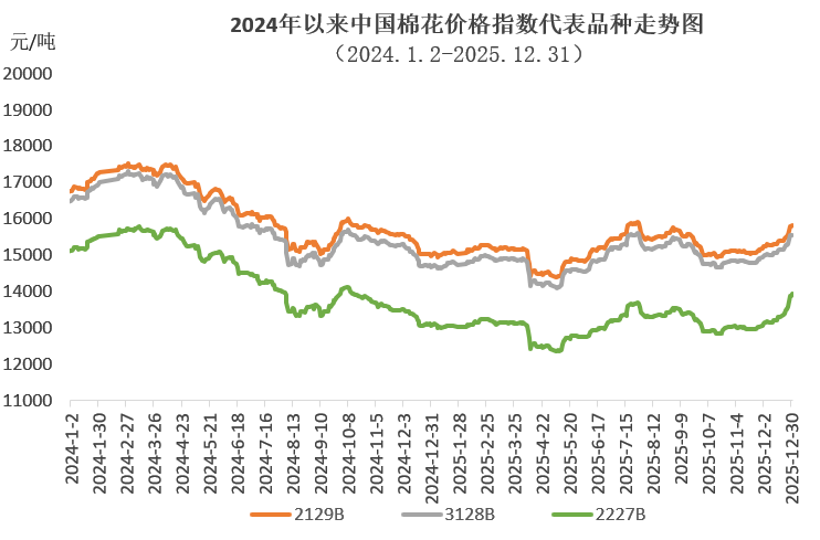 2025年國內(nèi)棉價震蕩運行,總體呈現(xiàn)“先穩(wěn)后跌、再漲回升”的波動走勢。受美國加征關(guān)稅政策沖擊,中國棉花價格指數(shù)年內(nèi)最低跌至14100元/噸,但在國內(nèi)促消費政策、中美經(jīng)貿(mào)磋商進展等因素影響下年中最高漲至15609元/噸,下半年新疆棉花產(chǎn)量再創(chuàng)新高,對棉價上漲有所抑制,但在宏觀環(huán)境改善的推動下年底仍回升至15500元/噸以上的年度相對高位。中國棉花價格指數(shù)全年均價14903元/噸,同比下跌6.7%。