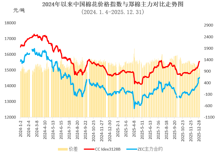 12月市場關(guān)注2026年棉花目標(biāo)價格政策調(diào)整,鄭棉期貨看漲預(yù)期較強,資金參與度顯著提升,主力合約CF2605震蕩上行,月初結(jié)算價在13760元/噸,月中突破14000元/噸關(guān)鍵阻力位后加速拉漲至月末14550元/噸高位。相比于現(xiàn)貨價格,期貨市場對基本面和消息面反應(yīng)更為強烈,期現(xiàn)價差有所縮小,月末鄭棉主力結(jié)算價14550元/噸,低于同期價格指數(shù)1006元/噸,兩者價差環(huán)比收窄185元/噸。鄭棉主力合約月均結(jié)算價14009元/噸,環(huán)比上漲467元,同比上漲504元。