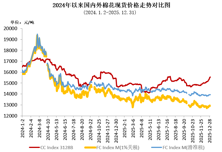 12月國內(nèi)棉價延續(xù)11月底漲勢,在宏觀政策利好、紡織市場淡季不淡合力推動下震蕩走高;國際棉價受美棉出口疲軟、庫存增加、美元走弱等因素影響先跌后反彈,均價環(huán)比下跌。內(nèi)外棉價走勢分化,價差持續(xù)擴大。