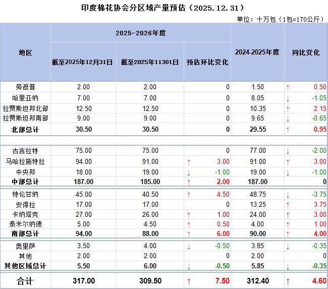 CAI將2025/26年度棉花出口預測下調(diào)30萬包,從上一年度的180萬包降至150萬包。截至12月底,已出口約45萬包。