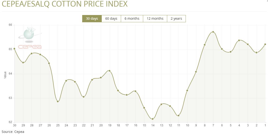 1月14日(周三),巴西CEPEA/ESALQ棉花價格指數(shù)報65.21美分/磅,較前一交易日上漲0.52%,較上月同期上漲3.00%。