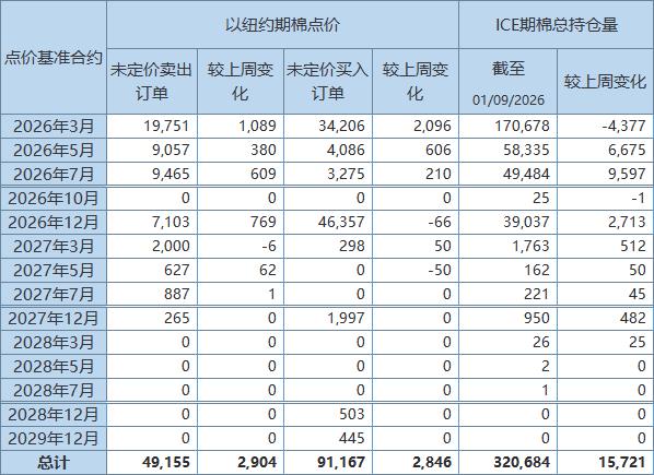 1月15日(周四),美國商品期貨交易委員會(CFTC)公布,截至1月9日,以ICE期棉2026年3月合約點價未定價賣出訂單(UnfixedCallSales)較前周增加1089手至19751手。