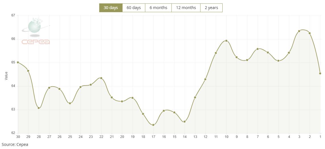 1月19日(周一),巴西CEPEA/ESALQ棉花價格指數(shù)報64.54美分/磅,較前一交易日下跌2.58%,較上月同期上漲1.61%。