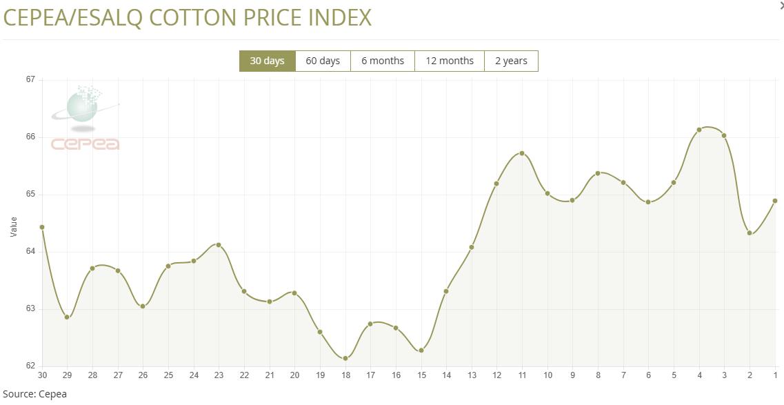1月20日(周二),巴西CEPEA/ESALQ棉花價格指數(shù)報64.89美分/磅,較前一交易日上漲0.87%,較上月同期上漲2.50%。