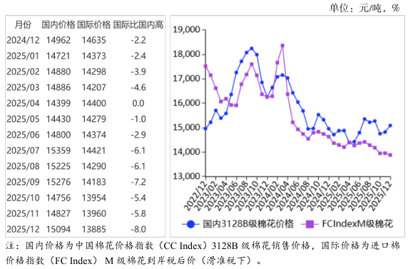 (一)國(guó)內(nèi)棉價(jià)環(huán)比上漲。下游需求保持剛性,支撐棉花季節(jié)性消費(fèi),帶動(dòng)國(guó)內(nèi)棉價(jià)上漲。12月,國(guó)內(nèi)3128B級(jí)棉花月均價(jià)每噸15094元,環(huán)比漲1.8%,同比漲0.9%。鄭棉期貨主力合約(CF605)月結(jié)算價(jià)每噸14495元,環(huán)比漲6.6%,同比漲7.3%。