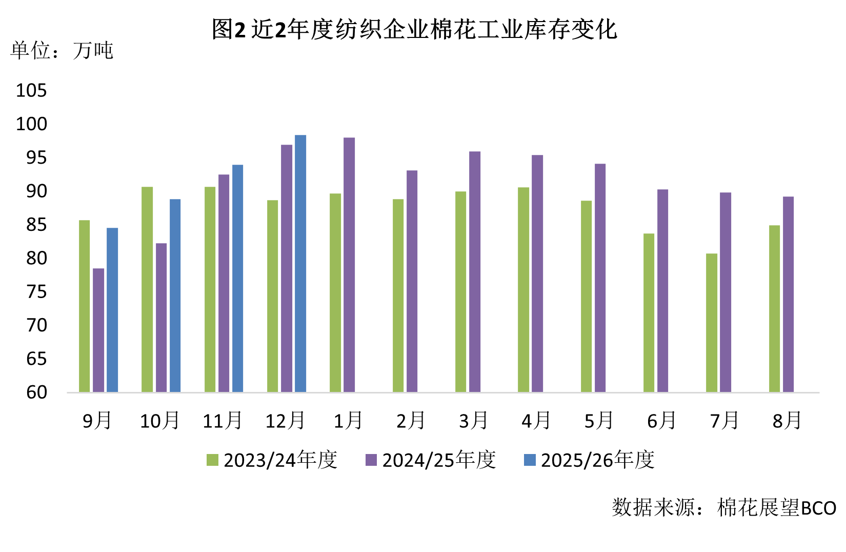 12月新棉仍處大量上市期,紡織廠根據(jù)需求隨用隨買,棉花庫(kù)存略有增加,截至12月底紡織廠在庫(kù)棉花工業(yè)庫(kù)存量為98.38萬噸,較上月底增加4.42萬噸。紡織廠可支配棉花庫(kù)存量為115.62萬噸,較上月底增加4.98萬噸。其中:20%企業(yè)增加棉花庫(kù)存,33%減少,47%基本保持不變。下半月隨著棉價(jià)上漲企業(yè)觀望態(tài)度增強(qiáng),原料采購(gòu)趨于謹(jǐn)慎。