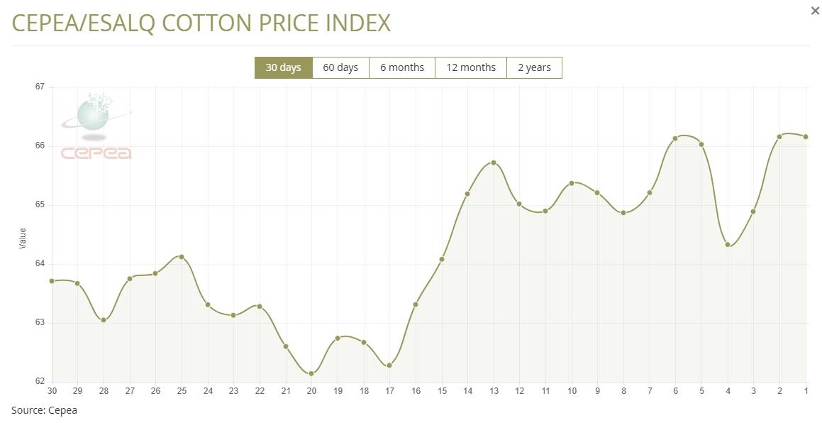 1月22日(周四),巴西CEPEA/ESALQ棉花價(jià)格指數(shù)報(bào)66.16美分/磅,較前一交易日持平,較上月同期上漲4.50%。