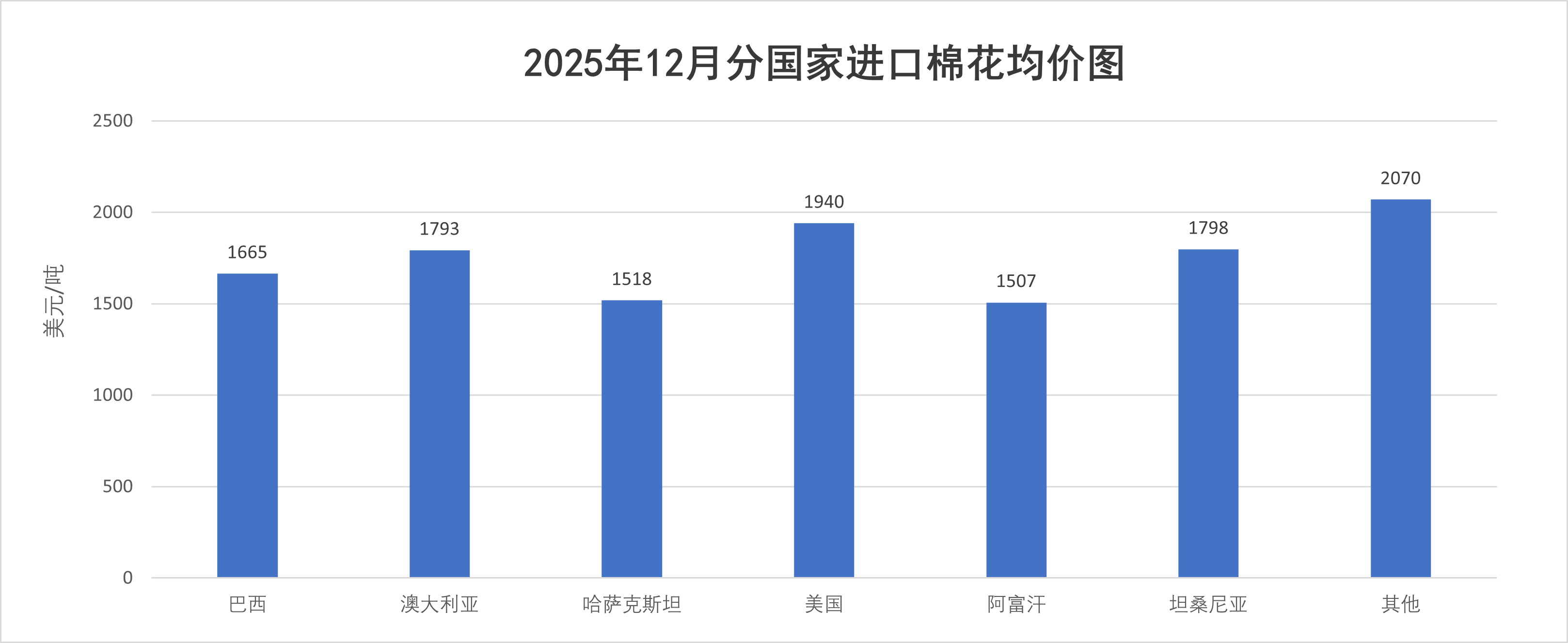 12月全球新棉供應(yīng)仍較充裕,疊加下游紡織需求復(fù)蘇乏力、企業(yè)補(bǔ)庫意愿低迷,從供需兩端壓制棉價。國際棉價延續(xù)弱勢震蕩走低,進(jìn)口月均價1711美元/噸,環(huán)比下跌0.9%,同比下跌9.4%。主要來源國中,巴西棉均價1665美元,同比下跌12.2%;澳棉均價1793美元/噸,同比下跌6.5%;美棉均價1940美元/噸,同比下跌11%。