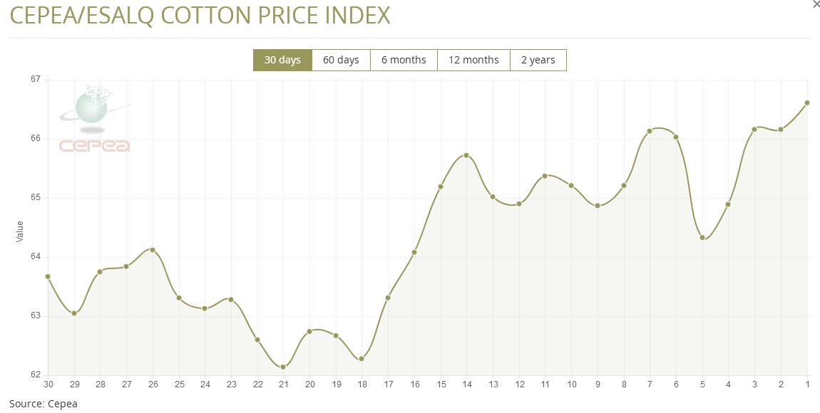 1月23日(周五),巴西CEPEA/ESALQ棉花價(jià)格指數(shù)報(bào)66.61美分/磅,較前一交易日上漲0.68,較上月同期上漲5.21%。
