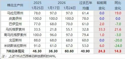 1月27日(周二),巴西國家商品供應(yīng)公司(Conab)公布的數(shù)據(jù)顯示,截至1月24日當(dāng)周,2025/26年度巴西棉花種植率為60.6%,前周為36.3%,上年同期為46.3%,五年均值為40.9%。