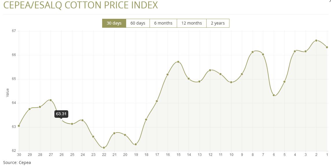 1月26日(周一),巴西CEPEA/ESALQ棉花價(jià)格指數(shù)報(bào)66.33美分/磅,較前一交易日下跌0.42%,較上月同期上漲4.77%。