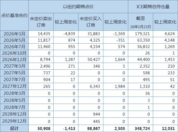 所有期棉合約點(diǎn)價(jià)未定價(jià)賣出訂單共50908手,較前周減少1413手。