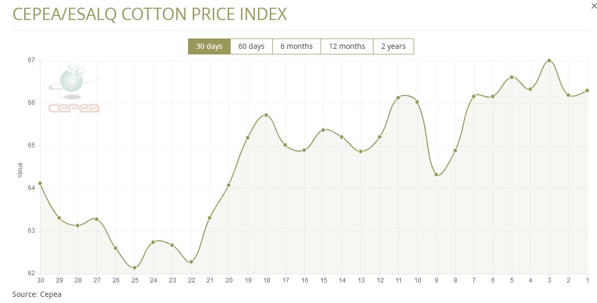 1月29日(周四),巴西CEPEA/ESALQ棉花價格指數(shù)報66.3美分/磅,較前一交易日上漲0.17%,較上月同期上漲4.72%。