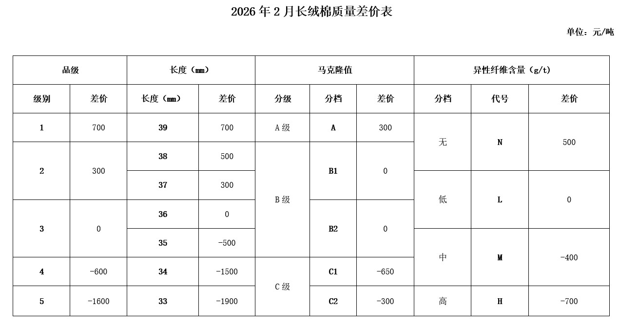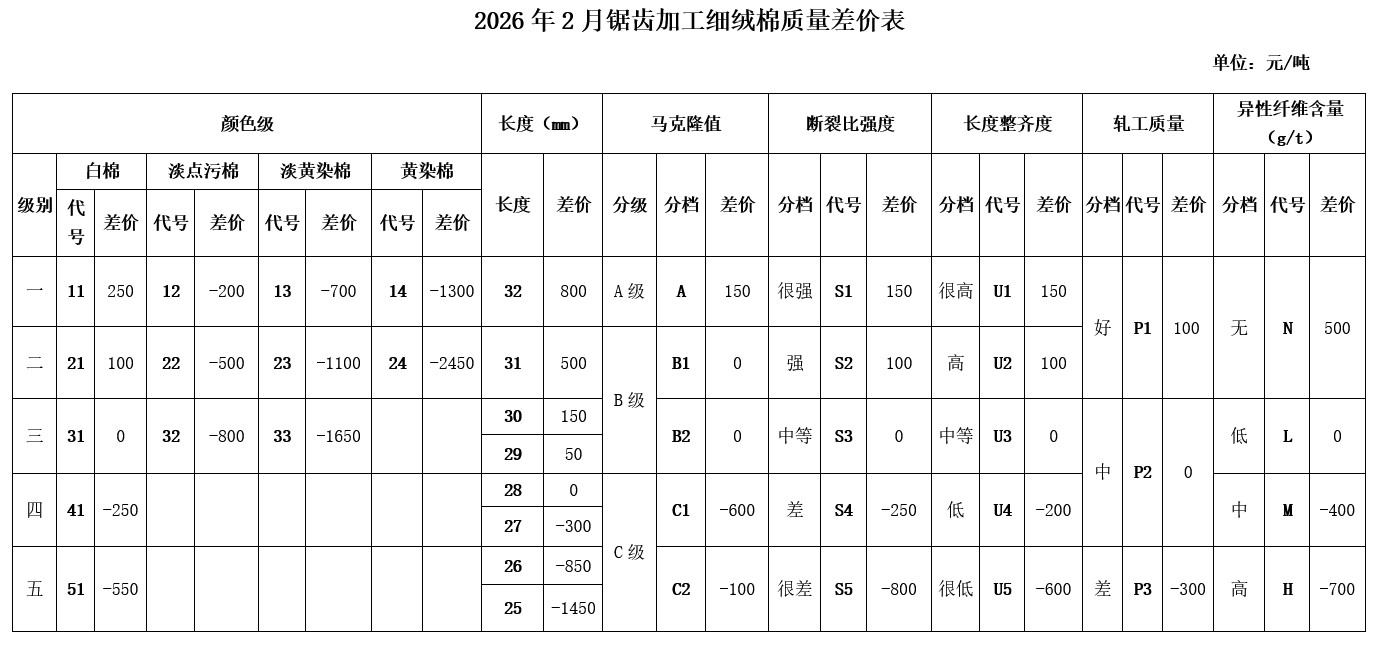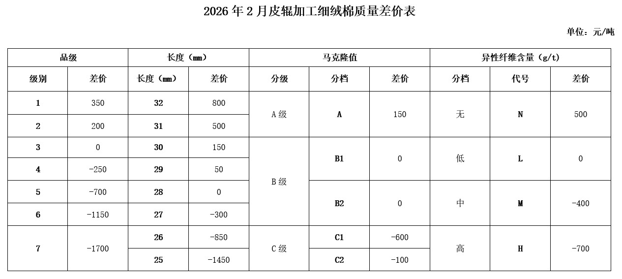據(jù)《中國棉花協(xié)會國產(chǎn)棉質(zhì)量差價表管理辦法》規(guī)定,現(xiàn)正式發(fā)布2026年2月《鋸齒加工細(xì)絨棉質(zhì)量差價表》、《皮輥加工細(xì)絨棉質(zhì)量差價表》、《長絨棉質(zhì)量差價表》(單位:元/噸)。
