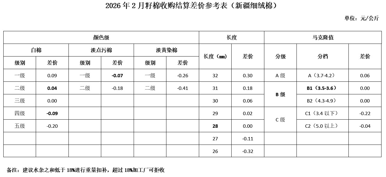根據(jù)《中國(guó)棉花協(xié)會(huì)籽棉收購(gòu)結(jié)算差價(jià)參考表(新疆細(xì)絨棉)管理辦法》規(guī)定,現(xiàn)正式發(fā)布2026年2月《籽棉收購(gòu)結(jié)算差價(jià)參考表(新疆細(xì)絨棉)》(單位:元/公斤),為新疆地區(qū)籽棉收購(gòu)提供參考。