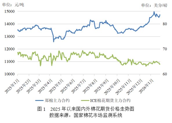 國內(nèi)市場(chǎng)方面,新疆植棉面積調(diào)減預(yù)期被逐步消化,市場(chǎng)觀望情緒再度升溫,鄭棉自高位回落;由于新棉銷售進(jìn)度較快、紡織廠補(bǔ)庫備貨積極,軋花廠、貿(mào)易企業(yè)挺價(jià)意愿較強(qiáng),現(xiàn)貨價(jià)格未跟隨鄭棉回落,仍保持高位運(yùn)行。截至1月29日,鄭棉主力合約結(jié)算價(jià)14900元/噸,較上月末上漲350元/噸,漲幅2.41%;代表內(nèi)地標(biāo)準(zhǔn)級(jí)皮棉市場(chǎng)價(jià)格的國家棉花價(jià)格B指數(shù)16057元/噸,較上月上漲546元/噸,漲幅3.52%。內(nèi)外價(jià)差由上月末的2986元/噸擴(kuò)大至3603元/噸,創(chuàng)近十年以來最高水平。