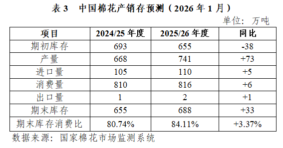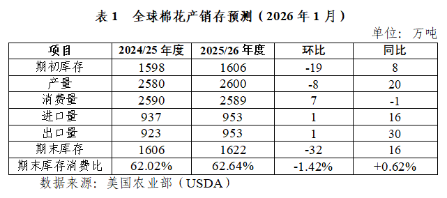 (二)從產(chǎn)需基本面看,本年度全球棉花供需格局延續(xù)寬松態(tài)勢(shì),下年度供需形勢(shì)可能偏緊。據(jù)美國農(nóng)業(yè)部2026年1月預(yù)測(cè),本年度全球棉花產(chǎn)量2600萬噸,同比增長0.8%;全球棉花消費(fèi)量2589萬噸,同比下降0.02%;全球棉花產(chǎn)大于需11萬噸,本年度供需寬松格局未改。其中中國、巴西棉花大幅增產(chǎn),印度、巴基斯坦棉花產(chǎn)量基本穩(wěn)定,美國、澳大利亞棉花略有減產(chǎn)。近期,國際市場(chǎng)棉花交易活躍,棉花主產(chǎn)國出口進(jìn)度較快。截至2025年11月末,本年度澳棉出口67.7萬噸,同比增長11.2%,出口進(jìn)度58.3%;截至12月末,巴西棉出口140.5萬噸,同比增長16%,出口進(jìn)度44.5%;美棉出口裝運(yùn)71.0萬噸,同比增長10.7%,出口進(jìn)度26.7%。