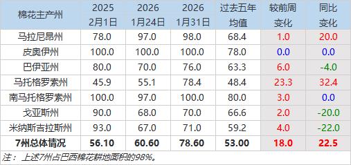 2月2日(周一),巴西國家商品供應(yīng)公司(Conab)公布的數(shù)據(jù)顯示,截至1月31日當(dāng)周,2025/26年度巴西棉花種植率為78.6%,前周為60.6%,上年同期為56.1%,五年均值為53%。