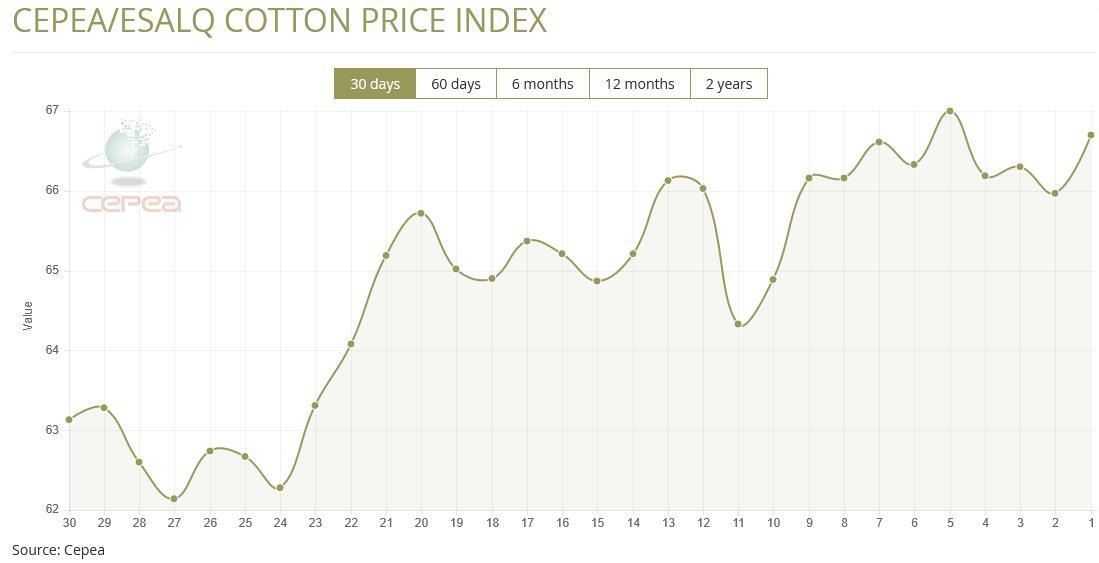 2月2日(周一),巴西CEPEA/ESALQ棉花價(jià)格指數(shù)報(bào)66.70美分/磅,較前一交易日上揚(yáng)1.11%,較上月同期上漲1.11%。