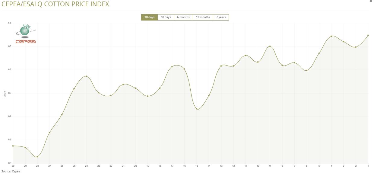 2月6日(周五),巴西CEPEA/ESALQ棉花價格指數(shù)報67.47美分/磅,較前一交易日上漲0.75%,較上月同期上漲2.27%。