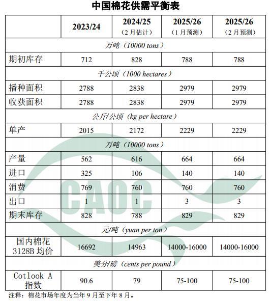 本月對中國棉花供需形勢預(yù)測與上月保持一致。全國新棉加工接近尾聲,紡織廠春節(jié)前備貨積極,皮棉銷售順暢。據(jù)中國棉花網(wǎng)數(shù)據(jù),截至2月5日,全國棉花加工率98.6%,同比減0.4個百分點,較過去四年均值增0.6個百分點;銷售率65.7%,同比增22.5個百分點,較過去四年均值增27.1個百分點。