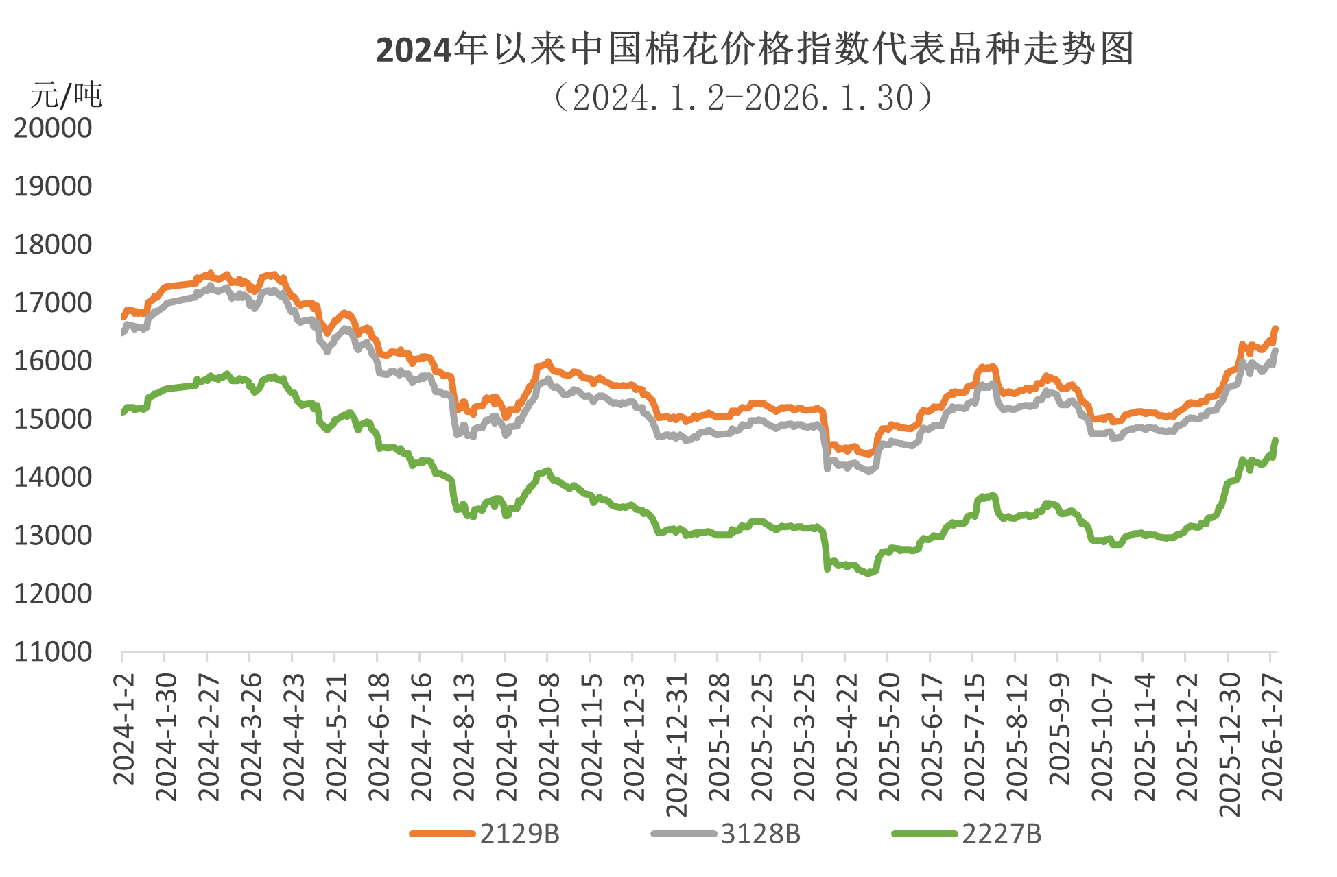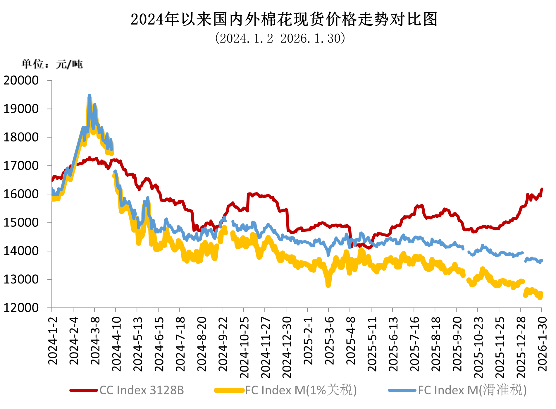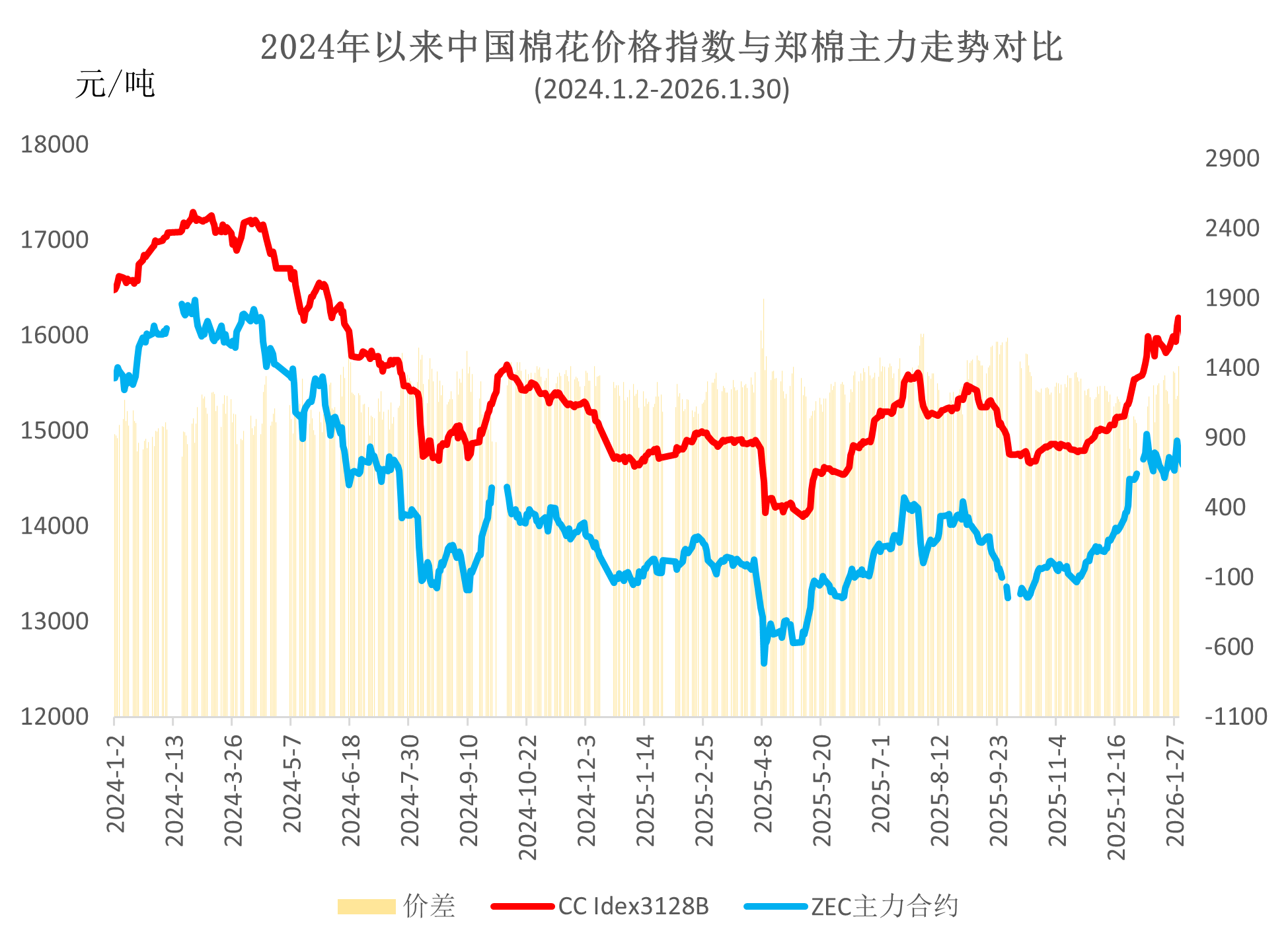 1月國內(nèi)棉價整體呈“前期沖高、中期震蕩、月末再漲”走勢。月初受央行工作會議定調(diào)2026年繼續(xù)實(shí)施適度寬松貨幣政策、新疆棉花種植面積調(diào)減預(yù)期等因素帶動,軋花及貿(mào)易企業(yè)挺價意愿較強(qiáng),疊加下游紡織廠春節(jié)前補(bǔ)庫需求旺盛,支撐現(xiàn)貨價格上漲;月中由于新棉供應(yīng)整體充足,加上內(nèi)外價差維持高位,進(jìn)口增量帶來供給壓力,國內(nèi)棉價維持窄幅波動;月末相關(guān)部門持續(xù)落實(shí)提振消費(fèi)系列舉措,企業(yè)對節(jié)后傳統(tǒng)紡織旺季有所期待,國內(nèi)棉價再次走強(qiáng),中國棉花價格指數(shù)月底收于最高點(diǎn)16183元/噸,創(chuàng)1年半以來新高,月均價15884元/噸,環(huán)比上漲731元,同比上漲1163元。