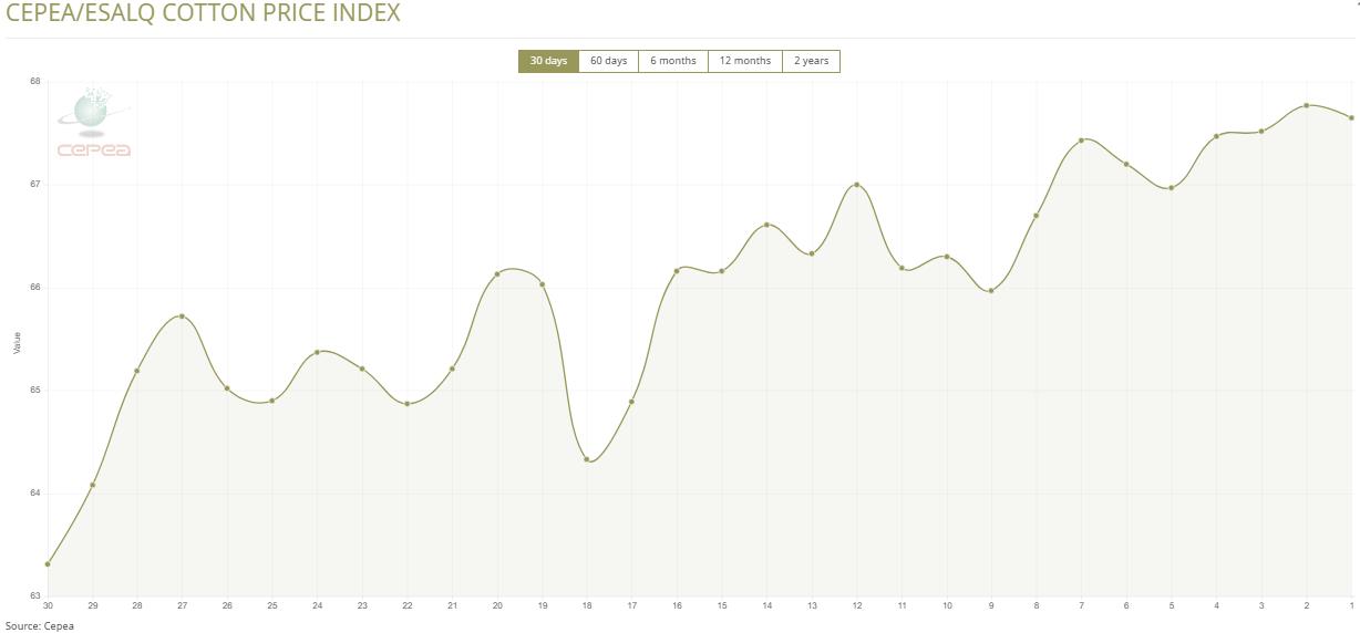 2月11日(周三),巴西CEPEA/ESALQ棉花價(jià)格指數(shù)報(bào)67.65美分/磅,較前一交易日下跌0.18%,較上月同期上漲2.55%。