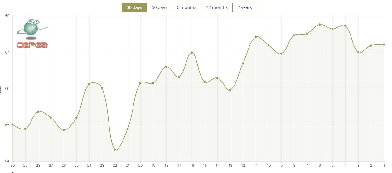 2月19日(周四),巴西CEPEA/ESALQ棉花價格指數(shù)報67.22美分/磅,較前一交易日上漲0.04%,較上月同期上漲1.89%。