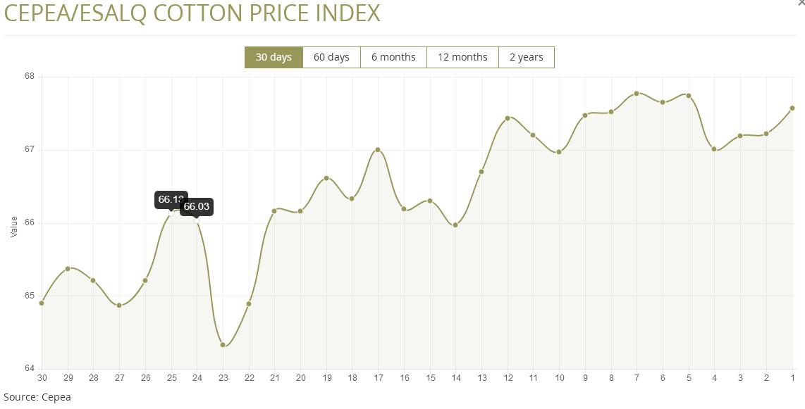 2月20日(周五),巴西CEPEA/ESALQ棉花價(jià)格指數(shù)報(bào)67.57美分/磅,較前一交易日上漲0.52%,較上月同期上漲2.43%。