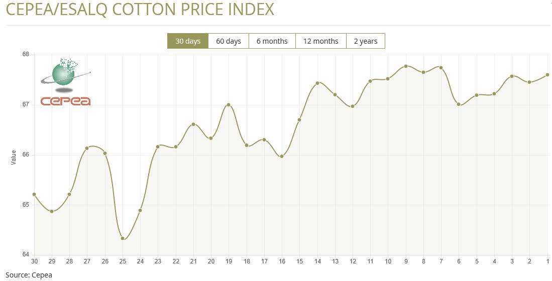 2月24日(周二),巴西CEPEA/ESALQ棉花價格指數(shù)報(bào)67.60美分/磅,較前一交易日上漲0.22%,較上月同期上漲2.47%。