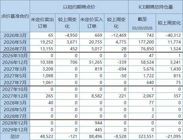 2月26日(周四),美國商品期貨交易委員會(CFTC)公布,截至2月20日,以ICE期棉2026年5月合約點價未定價賣出訂單(UnfixedCallSales)較前周增加3671手至19252手。