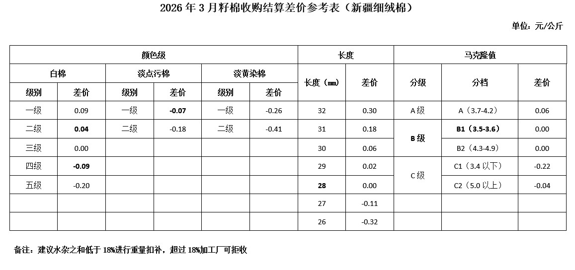 根據(jù)《中國棉花協(xié)會籽棉收購結(jié)算差價參考表(新疆細(xì)絨棉)管理辦法》規(guī)定,現(xiàn)正式發(fā)布2026年3月《籽棉收購結(jié)算差價參考表(新疆細(xì)絨棉)》(單位:元/公斤),為新疆地區(qū)籽棉收購提供參考。