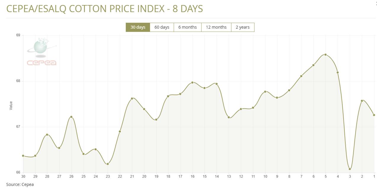 3月5日(周四),巴西CEPEA/ESALQ棉花價格指數(shù)報67.26美分/磅,較前一交易日下跌0.46%,較上月同期下跌1.92%。