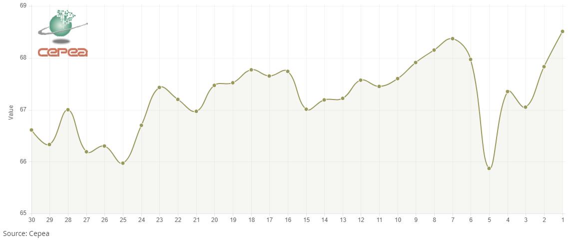 3月9日(周一),巴西CEPEA/ESALQ棉花價(jià)格指數(shù)報(bào)68.51美分/磅,較前一交易日上漲1.00%,較上月同期上漲0.20%。