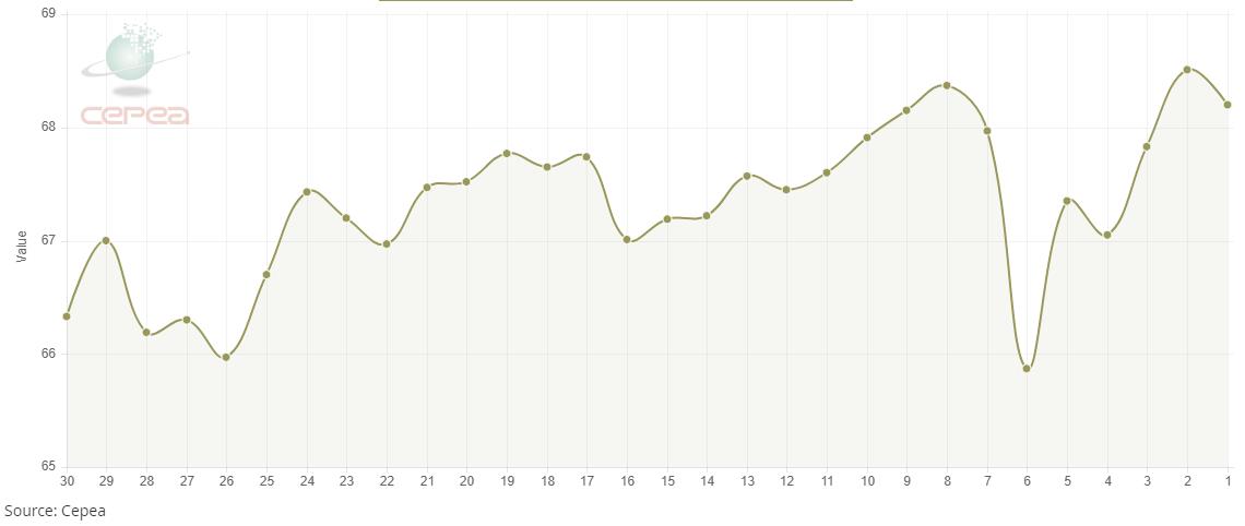 3月10日(周二),巴西CEPEA/ESALQ棉花價(jià)格指數(shù)報(bào)68.20美分/磅,較前一交易日下跌0.45%,較上月同期下跌0.25%。