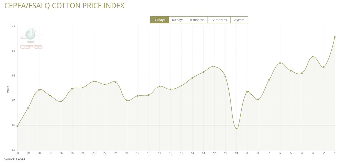 3月16日(周一),巴西CEPEA/ESALQ棉花價(jià)格指數(shù)報(bào)69.56美分/磅,較前一交易日上漲1.77%,較上月同期上漲1.74%。