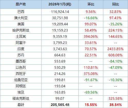 據(jù)海關(guān)統(tǒng)計數(shù)據(jù),2026年1月我國進(jìn)口棉花約21萬噸,環(huán)比增加約3萬噸,同比增長約38.5%。