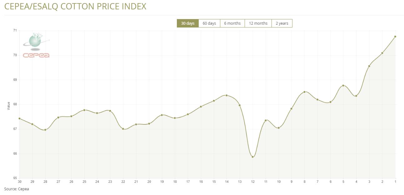 3月18日(周三),巴西CEPEA/ESALQ棉花價格指數(shù)報70.76美分/磅,較前一交易日上漲0.96%,較上月同期上漲3.50%。