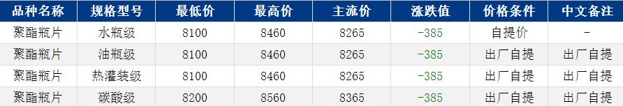 華東聚酯瓶片收于8265元/噸,漲跌值-385元/噸,原油下跌,帶動聚酯產(chǎn)品下滑。加之終端需求表現(xiàn)偏弱,聚酯瓶片重心下滑。持貨商出貨為主,3月主流貨源報盤8100-8460元/噸,部分貨源略低7900-8000元/噸;遞盤8050-8300元/噸。