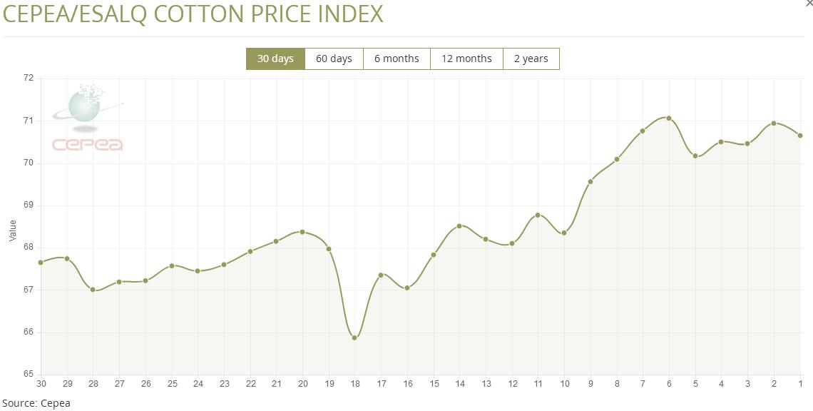 3月26日(周四),巴西CEPEA/ESALQ棉花價(jià)格指數(shù)報(bào)70.65美分/磅,較前一交易日下跌0.41%,較上月同期上漲3.33%。