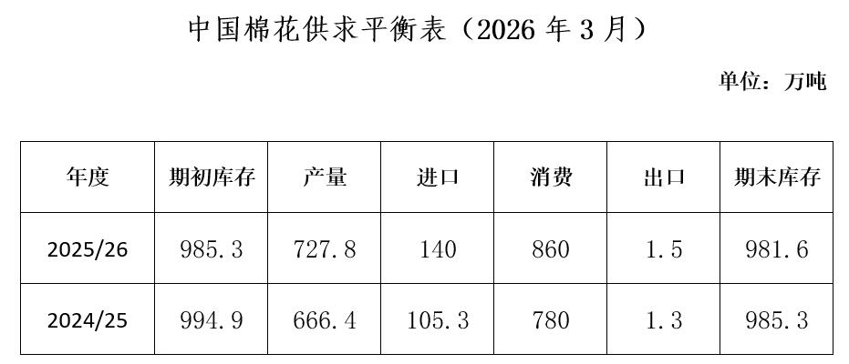 考慮到新疆紡紗產(chǎn)能持續(xù)擴(kuò)張成為國內(nèi)棉花消費(fèi)增長的核心驅(qū)動(dòng)力,年初2個(gè)月我國紡織品服裝出口明顯回暖,及2月底中東沖突暴發(fā)推升原油價(jià)格飆升,化纖對(duì)棉花替代效應(yīng)階段性減弱,疊加傳統(tǒng)消費(fèi)旺季臨近,全年度棉花消費(fèi)呈回升趨勢,同時(shí),據(jù)新棉加工檢驗(yàn)及新增配額情況,中國棉花協(xié)會(huì)調(diào)增本年度棉花產(chǎn)量、進(jìn)口量和消費(fèi)量,預(yù)計(jì)2025/26年度全國棉花產(chǎn)量741.3萬噸,同比增長11.2%,較上期調(diào)增13.5萬噸;進(jìn)口量140萬噸,同比增長33%,較上期調(diào)增30萬噸;消費(fèi)量860萬噸,同比增長10.3%,較上期調(diào)增50萬噸;出口1.1萬噸,同比下降15.4%,較上期調(diào)減0.4萬噸;期末庫存為1005.5萬噸,同比增長2.1%。