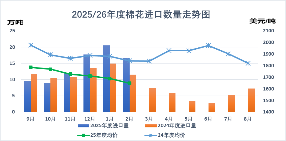 據(jù)海關(guān)數(shù)據(jù),2月我國(guó)進(jìn)口棉花16.6萬(wàn)噸,環(huán)比下降18.9%,同比增長(zhǎng)44.1%。2026年前2個(gè)月進(jìn)口棉花37.2萬(wàn)噸,同比增長(zhǎng)41%。2025/26年度前6個(gè)月進(jìn)口85.1萬(wàn)噸,同比增長(zhǎng)16.5%。本月進(jìn)口量環(huán)比回落,主要是春節(jié)假期港口通關(guān)效率受到影響,企業(yè)采購(gòu)節(jié)奏有所放緩;同比大幅增長(zhǎng),主要由于外棉價(jià)格優(yōu)勢(shì)突出,下游紡織廠補(bǔ)庫(kù)需求旺盛,前期預(yù)購(gòu)訂單集中到港。