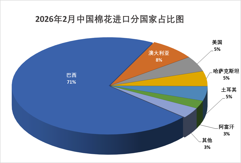 2026年2月,內(nèi)外棉價(jià)差持續(xù)擴(kuò)大,疊加中美關(guān)稅政策階段性調(diào)整,我國(guó)棉花進(jìn)口同比顯著增長(zhǎng),但受春節(jié)假期影響環(huán)比有所回落,巴西棉穩(wěn)居進(jìn)口來(lái)源國(guó)首位。為保障紡織廠需求,國(guó)家有關(guān)部門于3月初增發(fā)棉花進(jìn)口滑準(zhǔn)稅加工貿(mào)易配額30萬(wàn)噸,有望緩解國(guó)內(nèi)供給壓力。
