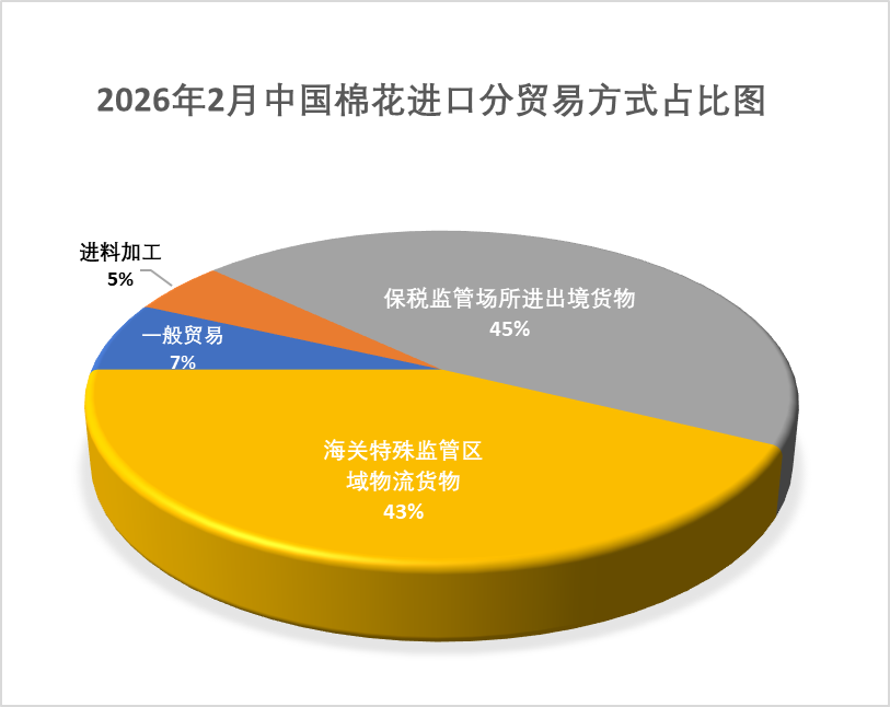 2月棉花進(jìn)口貿(mào)易方式中,保稅監(jiān)管場(chǎng)所進(jìn)出境貨物方式占比最高,達(dá)45%,環(huán)比下降3個(gè)百分點(diǎn);海關(guān)特殊監(jiān)管區(qū)域物流貨物占比43%,環(huán)比上升10個(gè)百分點(diǎn);進(jìn)料加工貿(mào)易占比5%,環(huán)比回落7個(gè)百分點(diǎn);一般貿(mào)易占比7%,與上月持平。