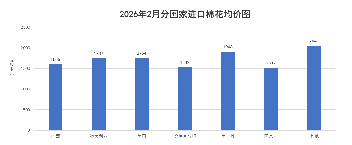 2月,受國(guó)際棉花市場(chǎng)供應(yīng)寬松、全球棉花產(chǎn)量上調(diào)等因素影響,ICE期棉價(jià)格走弱,我國(guó)棉花進(jìn)口月均價(jià)1649美元/噸,環(huán)比下跌2.4%,同比下跌10.5%。主要來(lái)源國(guó)中,巴西棉均價(jià)1606美元,同比下跌11.9%;澳大利亞棉均價(jià)1747美元/噸,同比下跌5%;美棉均價(jià)1754美元/噸,同比下跌5.4%。