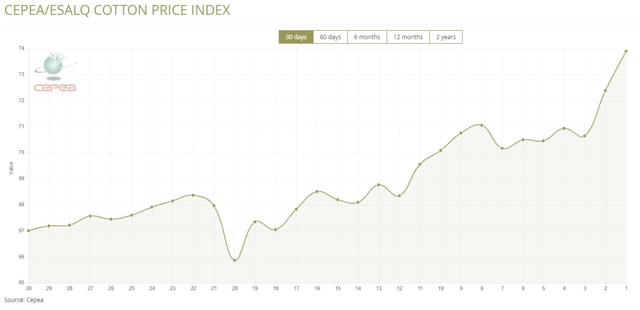 3月30日(周一),巴西CEPEA/ESALQ棉花價(jià)格指數(shù)報(bào)73.90美分/磅,較前一交易日上漲2.09%,較上月同期上漲8.09%。