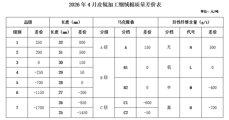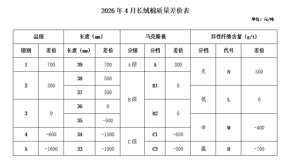 依據(jù)2026年3月的棉花公檢質(zhì)量數(shù)據(jù)、中國棉花協(xié)會質(zhì)量差價系統(tǒng)采集的加工企業(yè)銷售價和紡織企業(yè)到廠價,及當(dāng)月的中國棉花價格指數(shù),并征求業(yè)內(nèi)相關(guān)專家的意見,與上月相比做出如下調(diào)整:
