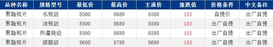華東聚酯瓶片收于8580元/噸,漲跌值185元/噸,外圍消息提振市場(chǎng),能化品全線上漲,聚酯瓶片重心大幅上揚(yáng)。4月主流貨源報(bào)盤8500-8680元/噸或期貨合約2605升水300-400,部分略低8350-8400元/噸;遞盤8500元/噸,下游追漲乏力,謹(jǐn)慎觀望中。