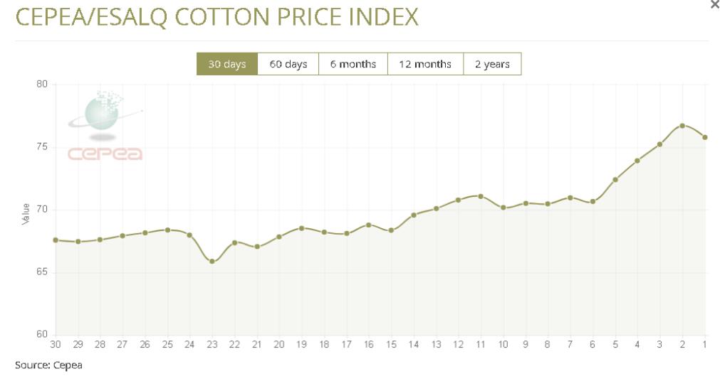4月2日(周四),巴西CEPEA/ESALQ棉花價(jià)格指數(shù)報(bào)75.77美分/磅,較前一交易日下跌1.20%,較上月同期上漲0.73%。